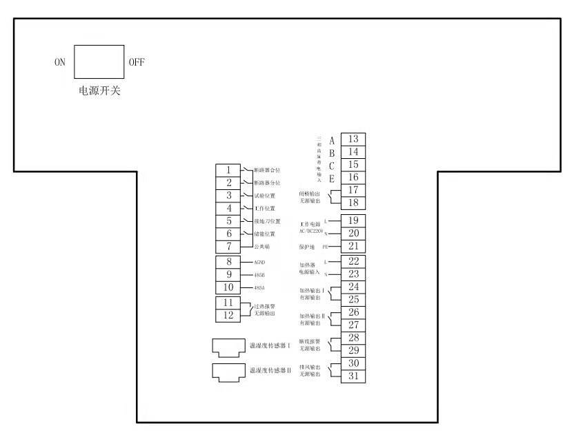 本设备具有RS485通讯接口,可实时传送手车位置状态、断路器位置状态、弹簧储能状态、接地开关状态、当前被测环境温湿度值等一系列参数(具体内容参照通讯规约)。